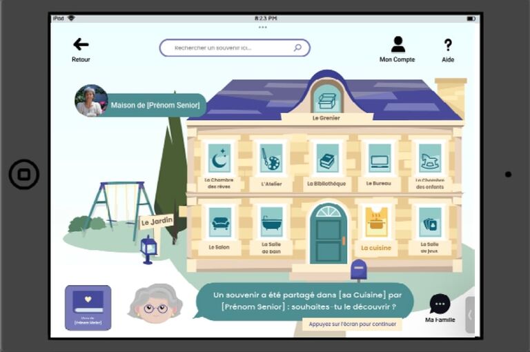 L’association Happy Madeleine, vouée à promouvoir le bien vieillir (notamment par le numérique) a conçu une application d’aide à la transmission intergénérationnelle : cet outil prend la forme d’une maison virtuelle où les grands-parents consignent leurs souvenirs pour les offrir en partage à leurs êtres chers.
